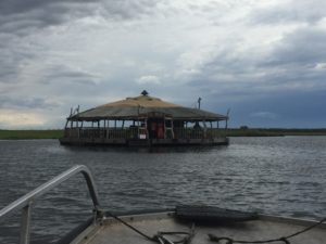 Po ježdění autem parkem nás Saruf po poledni vzal na loď, na řeku Chobe, jejíž plavbu jsme začali obědem v restauraci The Raft, což je pohostinství plovoucí přímo na řece a vlastně už náležící namibijské straně. Přepluli jsme přes čáru bez pasů, a to jeden z nás je povoláním konzul. Tomu se říká příklad.