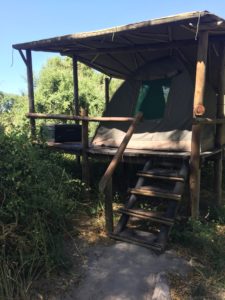 Naší destinací v Okavango deltě byl kemp Oddballs, což by se dalo přeložit do češtiny jako kemp Podivínů. Jedná se o stanový kemp, v těsné blízkosti jednoho z kanálů, kdy stany jsou postaveny na dřevěných podstavcích a jako šatník slouží velká uzavíratelná truhla před ním. Koupelna je také značně přírodní, byť vymoženost toaletní místy zde v poněkud vzdušnějším záchodovém koutku byla. Sprcha pak fungovala stylem „napusť si kbelík vodou, vytáhni ho přes kladku nahoru a skrz hadici instalovanou v jeho dně, na sebe spusť sprchu“. Jednoduché, praktické a hlavně funkční. A pokud chce člověk i dlouhou sprchu, trošku si před tím mákne.