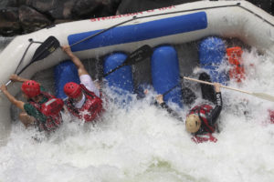 S helmičkami na hlavě, vestami na sobě, pádly v rukách a počátečním názorném předvedení, jak se tahá člověk z vody zpět do raftu a upřesnění si základních povelů od kapitána Steva, jsme vypluli vstříc peřejím. Já měl tu čest sedět na špici lodi společně s izraelským jinochem a udávat tak tempo pádlování, za mými zády jsem měl svou drahou polovičku, na druhé straně raftu Hezuckého. Steve samozřejmě seděl vzadu u kormidla a před ním „plavání neznalá“ a „pár temp jsem už v životě udělala“ Korejky.