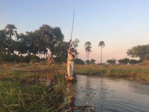Když už jsem byl u výhod kempu příp. Okavango delty jako takové, rozhodně nelze opomenout rozdílný druh safari než klasické ježdění autem po národních parcích. Zde totiž safari probíhá dvěma způsoby – buď na malých dřevěných loďkách, tzv. mokoro, po kanálech anebo pěšky. Jelikož u nás nebyla hladina vody vysoká, kanály delty nijak rozvodněny, nás se týkala druhá varianta, kdy loďkou jsme se vždy jen dostali přes asi 10ti metrový kanál na druhou stranu od kempu a dále pokračovali po svých. Přičemž ať už na loďkách či po svých, vždy se jde ve dvou s jedním průvodcem. Či v malých skupinkách. Ono se ani víc lidí než dva a průvodce s bidlem v ruce do mokoro loďky nevejde. Plus tu jste opravdu součástí přírody a dělat nějaká velká procesí asi není úplně záhodno.