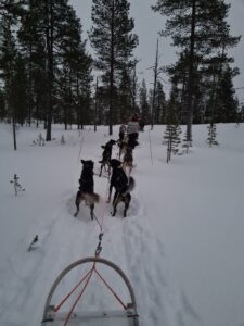 Šestý den byl ve znamení psího spřežení. Ne, že by to byla aktivita na celý den, ale procházky sněhem nebo co jsme měli k snídani asi nemusím popisovat. Ačkoli i ta zimní krajina stála za to. Jak v pohádce.