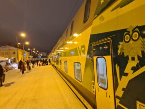 Zpět k vlaku. Rychlovlak ala Francie, Německo to není. Taková rychlejší drncálka. Oněch 800 km mu zabere celou noc, takřka 12 hodin. Měli jsme kupéčka s vlastní koupelnou, záchodem. Což nebylo od věci. Ale nepředstavujte si to jako pokoj v Alcronu. Podmínky dosti stísněné, kór ještě s malým dítětem a milionem zavazadel. (kočárek musel jít na volnou postel k Christianovi) Ve dvou, v létě, s méně bágly, by to byl super výlet. Takhle dobrý, ale asi jednodušší příště přeletět. Obzvlášť, když cílem není Rovaniemi, ale Saariselkä ležící další tři hodiny autem severněji. A jak jsme později zjistili, letiště je i v téhle polární krajině.