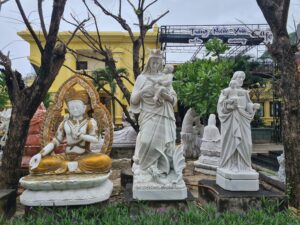 Pokud byste zavítali do těchto končit a nemohli snad natrefit na cestu k těmto skalám, což by značilo jisté problém se zrakem, v okruhu 5 kilometrů kolem je to samý obchod se sochami. A to tak že zástupy soch. Všeho druhu. Ať jste jakéhokoli vyznání, či ateista, vybere si každý. Ne nadarmo ve Vietnamu vzniklo i synkretické náboženství zvané Kaodaismus. To slučuje tak nějak všechna, min. ta větší a známější, náboženství do sebe. K tomu přidává osvícené duchy, jež se zjevují věřícím, a jsou reprezentováni známými osobnostmi jako např. Julius Caesar, Winston Churchill nebo V. I. Lenin. Takže vlastně i celkem sranda. Avšak prvotní myšlenka se mi líbí – za většinu válek světa mohlo náboženství, tak proč to nehodit vše do jednoho pytle a nemít jednoho boha, ke kterému bychom všichni vzhlíželi. A nehádali se kvůli němu. Nestříleli.